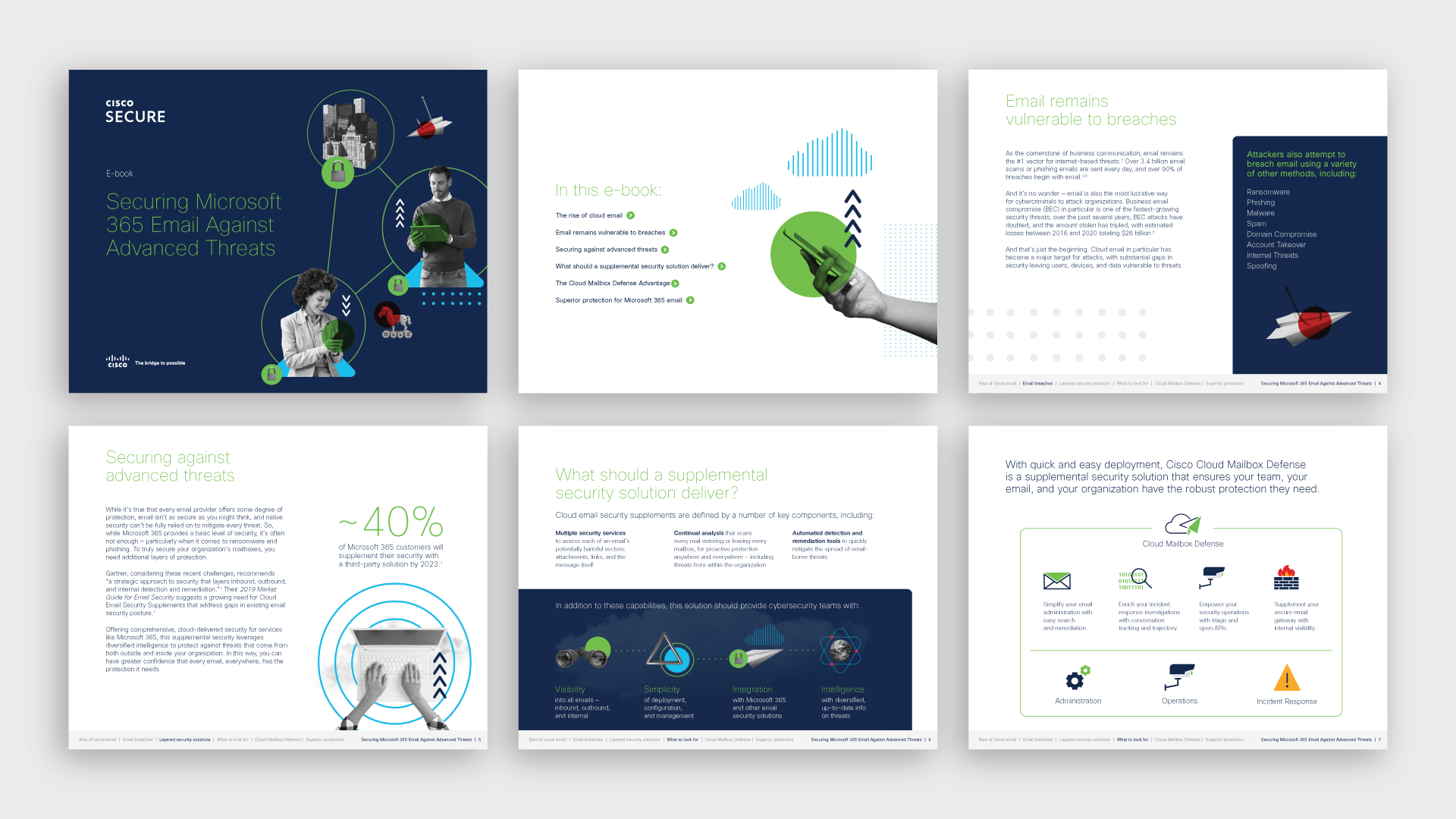 Design + ConceptDesign and layout for key Cisco Cloud Email Defense assets, focused on turning complex security concepts into clear, approachable visuals.